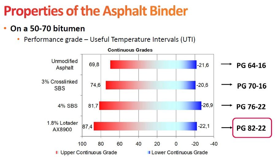 ทำให้ได้คุณภาพผิวทางที่ไม่แข็งเปราะ ไม่แตกร้าวง่าย มีความยืดหยุ่นสูง เหมาะสำหรับเส้นทางที่มีปริมาณจราจรสูง ป้องกันไม่ให้เกิดการทรุดตัวจนเป็นร่องล้อถาวรได้ง่าย และช่วยยืดอายุของถนน