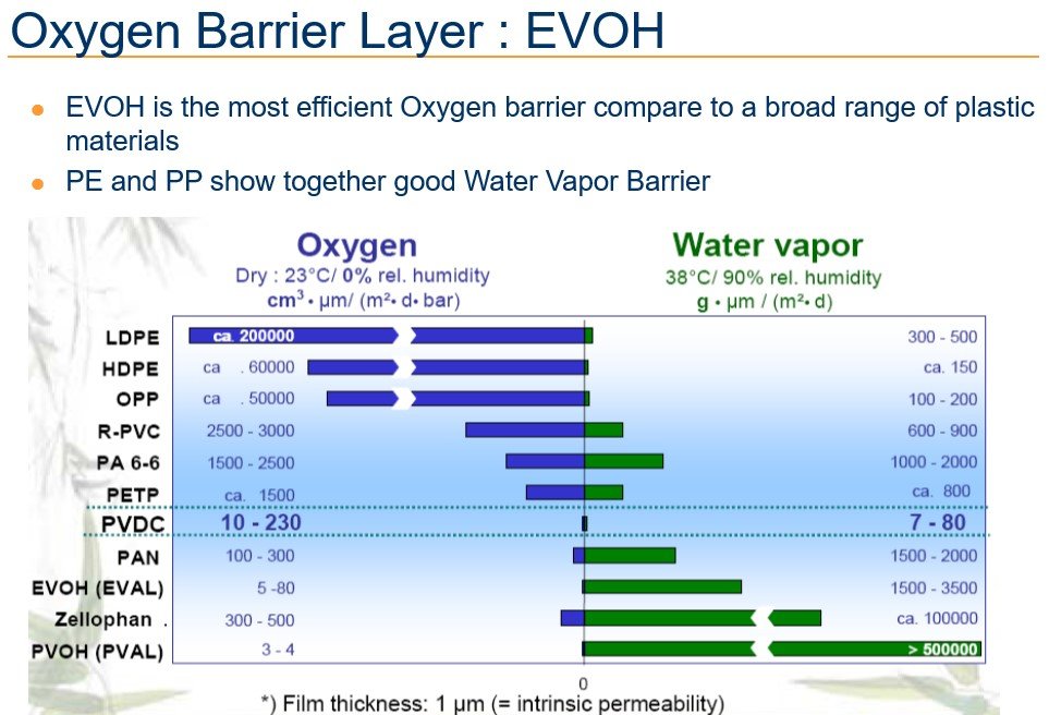 EVOH มีคุณสมบัติที่ป้องกันออกซิเจนที่ดีมากๆ เมื่อเทียบกับโพลีเมอร์ชนิดอื่นๆ (ภายใต้สภาวะที่ควบคุมได้โดยการออกแบบชั้นโครงสร้างที่เหมาะสม)