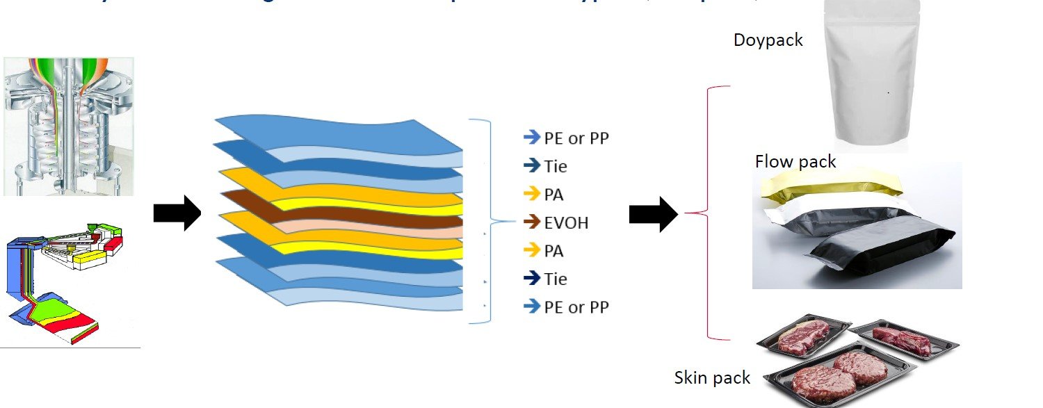 - ฟิล์ม Multilayer Barrier สำหรับอาหาร -> PET/PE/tie/EVOH/tie/PE
